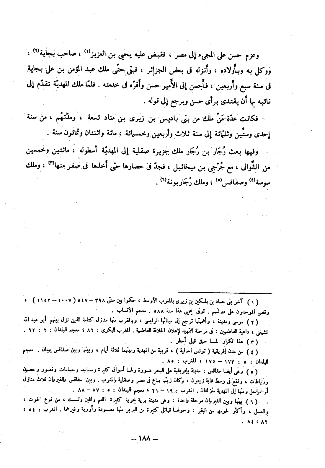 فكانت عدة من ملك من بني باديس بن زيرى بن مناد تسعة، ومدتهم، من سنة إحدى وستين وثلثمائة إلى سنة ثلاث وأربعين وخمسمائة، مائة واثنتان وثمانون سنة.
