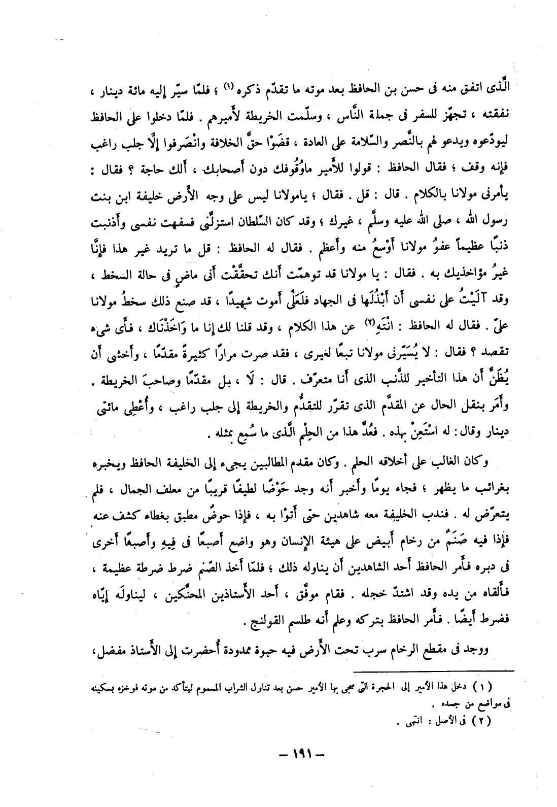 الذي اتفق منه في حسن بن الحافظ بعد موته ما تقدم ذكره؛ فلما سير إليه مائة دينار، نفقته، تجهز للسفر في جملة الناس، وسلمت الخريطة لأميرهم. فلما دخلوا على الحافظ ليودعوه ويدعو لهم بالنصر والسلامة على العادة، قضوا حق الخلافة وانصرفوا إلا جلب راغب فإنه وقف؛ فقال الحافظ: قولوا للأمير ما وقوفك دون أصحابك، ألك حاجة؟ فقال: يأمرني مولانا بالكلام. قال: قل. فقال؛ يا مولانا ليس على وجه الأرض خليفة ابن بنت رسول الله، صَلَّى اللهُ عَلَيْهِ وَسَلَّمَ، غيرك؛ وقد كان السلطان استزلني فسفهت نفسي وأذنبت ذنباً عظيماً عفوا مولانا أوسع منه وأعظم. فقال له الحافظ: قل ما تريد غير هذا فإنا غير مؤاخذيك به. فقال: يا مولانا قد توهمت أنك تحققت أني ماض في حالة السخط، وقد آليت على نفسي أن أبذلها في الجهاد فلعلي أموت شهيداً، قد صنع ذلك سخط مولانا علي. فقال له الحافظ: انته عن هذا الكلام، وقد قلنا لك إنا ما واخذناك، فأي شيء تقصد؟ فقال: لا يسيرني مولانا تبعاً لغيري، فقد صرت مراراً كثيرةً مقدماً، وأخشى أن يظن أن هذا التأخير للذنب الذي أنا متعرف. قال: لا، بل مقدماً وصاحب الخريطة. وأمر بنقل الحال عن المقدم الذي تقرر للتقدم والخريطة إلى جلب راغب، وأعطى مائتي دينار وقال: له استعن بهذه. فعد هذا من الحلم الذي ما سمع بمثله.