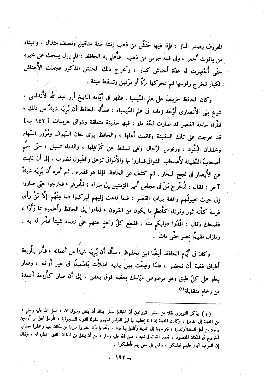 المعروف بصدر الباز، فإذا فيها حنش من ذهب زنته ستة مثاقيل ونصف مثقال، وعيناه من ياقوت أحمر، وفي فمه جرس من ذهب. فأعلم به الحافظ، فلم يزل يبحث عن خبره حتى أحضرت له عدة أحناش كبار، وأخرج ذلك الحنش المذكور فجعلت الأحناش الكبار تخرج رءوسها ثم تحركها مرةً أو مرتين وتسقط ميتة.