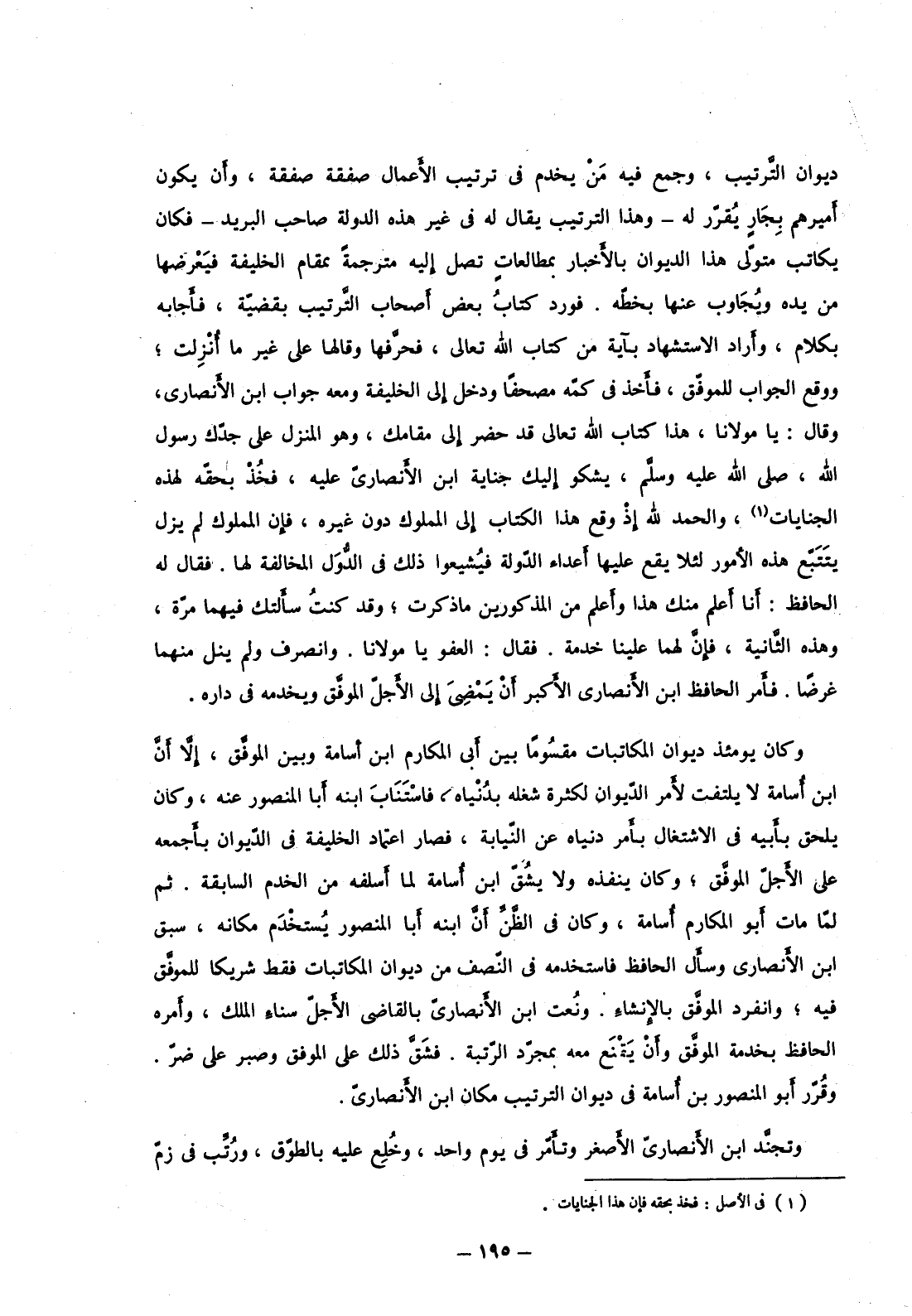 ديوان الترتيب، وجمع فيه من يخدم في ترتيب الأعمال صفقة صفقة، وأن يكون أميرهم بجار يقرر له وهذا الترتيب يقال له في غير هذه الدولة صاحب البريد فكان يكاتب متولى هذا الديوان بالأخبار بمطالعات تصل إليه مترجمةً بمقام الخليفة فيعرضها من يده ويجاوب عنها بخطه. فورد كتاب بعض أصحاب الترتيب بقضية، فأجابه بكلام، وأراد الاستشهاد بآية من كتاب الله تعالى، فحرفها وقالها على غير ما أنزلت؛ ووقع الجواب للموفق، فأخذ في كمه مصحفاً ودخل إلى الخليفة ومعه جواب ابن الأنصاري، وقال: يا مولانا، هذا كتاب الله تعالى قد حضر إلى مقامك، وهو المنزل على جدك رسول الله، صَلَّى اللهُ عَلَيْهِ وَسَلَّمَ، يشكو إليك جناية ابن الأنصاري عليه، فخذ بحقه لهذه الجنايات، والحمد لله إذ وقع هذا الكتاب إلى المملوك دون غيره، فإن المملوك لم يزل يتتبع هذه الأمور لئلا يقع عليها أعداء الدولة فيشيعوا ذلك في الدول المخالفة لها. فقال له الحافظ: أنا أعلم منك هذا وأعلم من المذكورين ما ذكرت؛ وقد كنت سألتك فيهما مرة، وهذه الثانية، فإن لهما علينا خدمة. فقال: العفو يا مولانا. وانصرف ولم ينل منهما غرضاً. فأمر الحافظ ابن الأنصاري الأكبر أن يمضى إلى الأجل الموفق ويخدمه في داره.