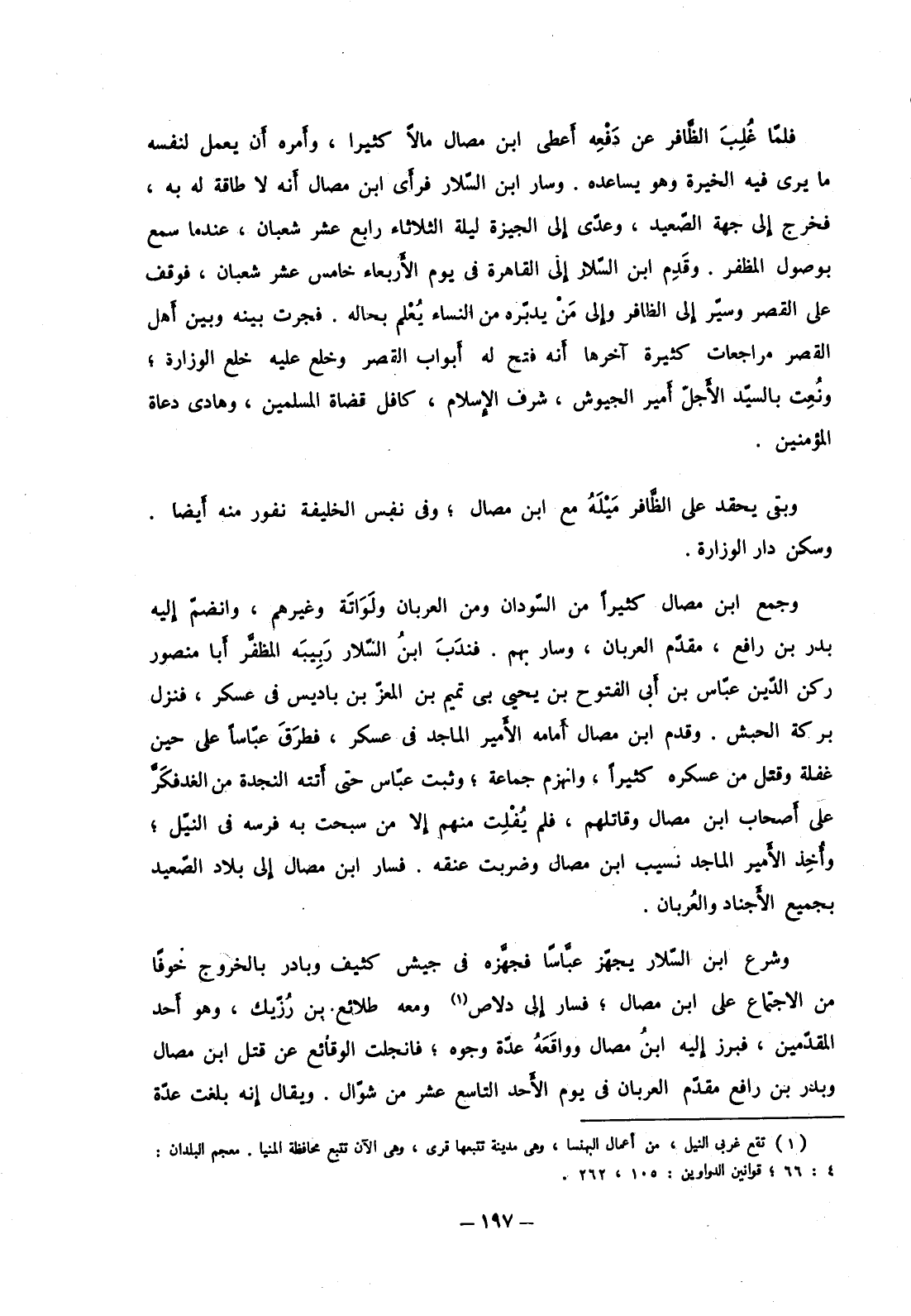 وجمع ابن مصال كثيراً من السودان ومن العربان ولواتة وغيرهم، وانضم إليه بدر بن رافع، مقدم العربان، وسار بهم. فندب ابن السلار ربيبه المظفر أبا منصور ركن الدين عباس بن أبي الفتوح بن يحيى بن تميم بن المعز بن باديس في عسكر، فنزل بركة الحبش. وقدم ابن مصال أمامه الماجد في عسكر، فطرق عباساً على حين غفلة وقتل من عسكره كثيراً، وانهزم جماعة؛ وثبت عباس حتى أتته النجدة من الغد فكر على أصحاب ابن مصال وقاتلهم، فلم يفلت منهم إلا من سبحت به فرسه في النيل؛ وأخذ الأمير الماجد نسيب ابن مصال وضربت عنقه. فسار ابن مصال إلى بلاد الصعيد بجميع الأجناد والعربان.