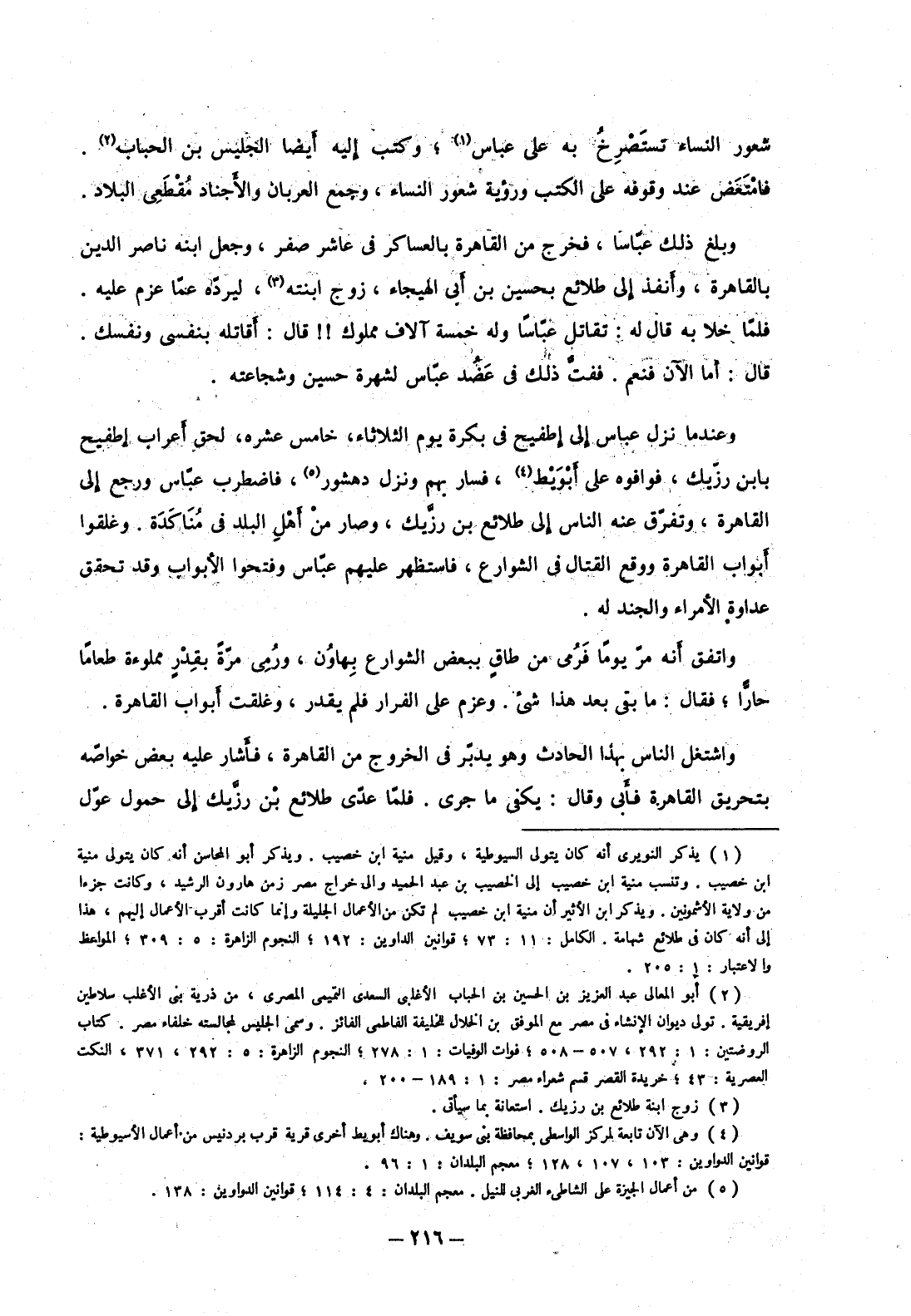 وبلغ ذلك عباسا، فخرج من القاهرة بالعساكر في عاشر صفر، وجعل ابنه ناصر الدين بالقاهرة، وأنفذ إلى طلائع بحسين بن أبي الهيجاء، زوج ابنته، ليرده عما عزم عليه. فلما خلا به قال له: تقاتل عباساً وله خمسة آلاف مملوك!! قال: أقتاله بنفسي ونفسك. قال: أما الآن فنعم. ففت ذلك في عضد عباس لشهرة حسين وشجاعته.