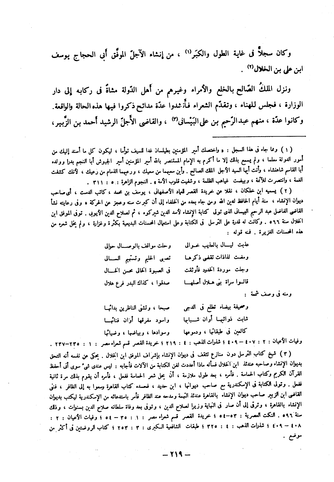 ونزل الملك الصالح بالخلع والأمراء وغيرهم من أهل الدولة مشاة في ركابه إلى دار الوزارة، فجلس للهناء، وتقدم الشعراء فأنشدوا عدة مدائح ذكروا فيها هذه الحالة والواقعة. وكانوا عدة، منهم عبد الرحيم بن علي البيساني، والقاضي الأجل الرشيد أحمد بن الزبير،