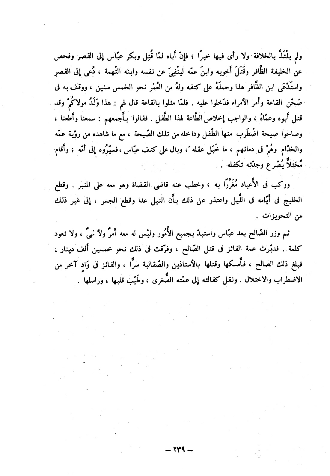 ثم وزر الصالح بعد عباس واستبد بجميع الأمور وليس له معه أمر ولا نهي، ولا تعود كلمة. فدبرت عمة الفائز في قتل الصالح، وفرقت في ذلك نحو خمسين ألف دينار. فبلغ ذلك الصالح، فأمسكها وقتلها بالأستاذين والصقالبة سراً، والفائز في واد آخر من الاضطراب والاختلال. ونقل كفالته إلى عمته الصغرى، وطيب قلبها، وراسلها.