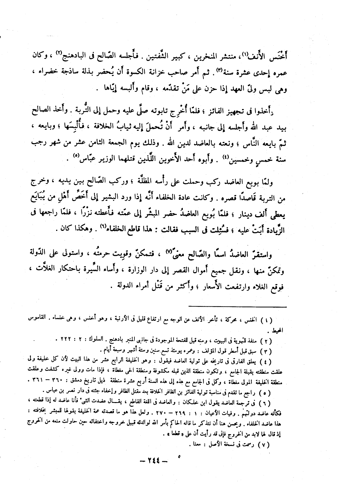 ولما بويع العاضد ركب وحملت على رأسه المظلة؛ وركب الصالح بين يديه، وخرج من التربة قاصداً قصره. وكانت عادة الخلفاء أنه إذا ورد البشير إلى أخص أهل من يبايع يعطى ألف دينار؛ فلما بويع العاضد حضر المبشر إلى عمته فأعطته نزراً، فلما راجعها في الزيادة أبت عليه؛ فسئلت في السبب فقالت: هذا قاطع الخلفاء. وهكذا كان.