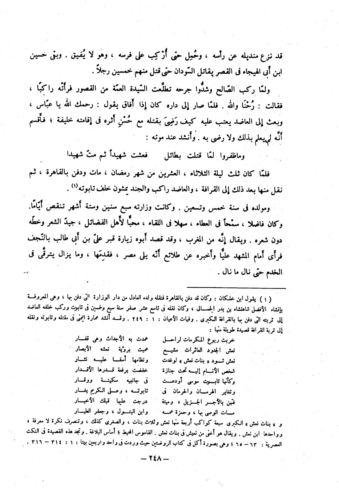 ولما ركب الصالح وشدوا جرحه تطلعت السيدة العمة من القصور فرأته راكباً، فقالت: رحنا والله. فلما صار إلى داره كان إذا أفاق يقول: رحمك الله يا عباس، وبعث إلى العاضد يعتب عليه كيف رضي بقتله مع حسن أثره في إقامته خليفة؛ فأقسم أنه لم يعلم بذلك ولا رضى به. وأنشد عند موته: