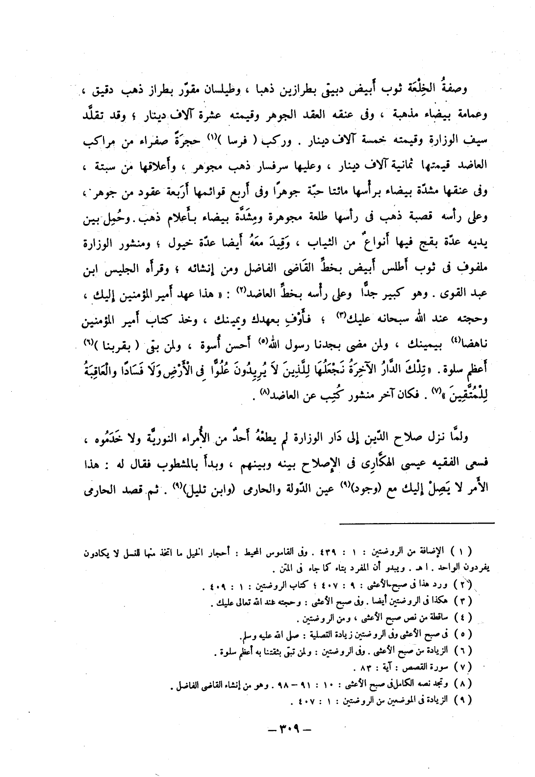 وصفة الخلعة ثوب أبيض دبيقي بطرازين ذهبا، وطيلسان مقور بطراز ذهب دقيق، وعمامة بيضاء مذهبة، وفي عنقه العقد الجوهر وقيمته عشرة آلاف دينار؛ وقد تقلد سيف الوزارة وقيمته خمسة آلاف دينار. وركب فرسا حجرةً صفراء من مراكب العاضد قيمتها ثمانية آلاف دينار، وعليها سرفسار ذهب مجوهر، وأعلاقها من سبتة، وفي عنقها مشدة بيضاء برأسها مائتا حبة جوهراً وفي أربع قوائمها أربعة عقود من جوهر، وعلى رأسه قصبة ذهب في رأسها طلعة مجوهرة ومشدة بيضاء بأعلام ذهب. وحمل بين يديه عدة بقج فيها أنواع من الثياب، وقيد معه أيضا عدة خيول؛ ومنشور الوزارة ملفوف في ثوب أطلس أبيض بخط القاضي الفاضل ومن إنشائه؛ وقرأه الجليس ابن عبد القوي. وهو كبير جداً وعلى رأسه بخط العاضد: هذا عهد أمير المؤمنين إليك، وحجته عند الله سبحانه عليك؛ فأوف بعهدك ويمينك، وخذ كتاب أمير المؤمنين ناهضا بيمينك، ولمن مضى بجدنا رسول الله أحسن أسوة، ولمن بقى بقربنا أعظم سلوة. " تِلْكَ الدَّارُ الآخِرَةُ نَجْعَلُهَا لِلَّذِينَ لاَ يُرِيِدُونَ عُلُوّاً في الأَرْضِ وَلاَ فَسَاداً والْعَاقِبَةُ لِلْمُتَّقِينَ ". فكان آخر منشور كتب عن العاضد.