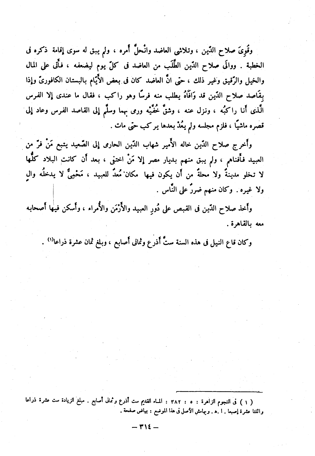 وأخرج صلاح الدين خاله الأمير شهاب الدين الحارمي إلى الصعيد يتبع من فر من العبيد فأفناهم، ولم يبق منهم بديار مصر إلا من اختفى، بعد أن كانت البلاد كلها لا تخلو مدينة ولا محلة من أن يكون فيها مكان معد للعبيد، محمي لا يدخله وال ولا غيره. وكان منهم ضرر على الناس.