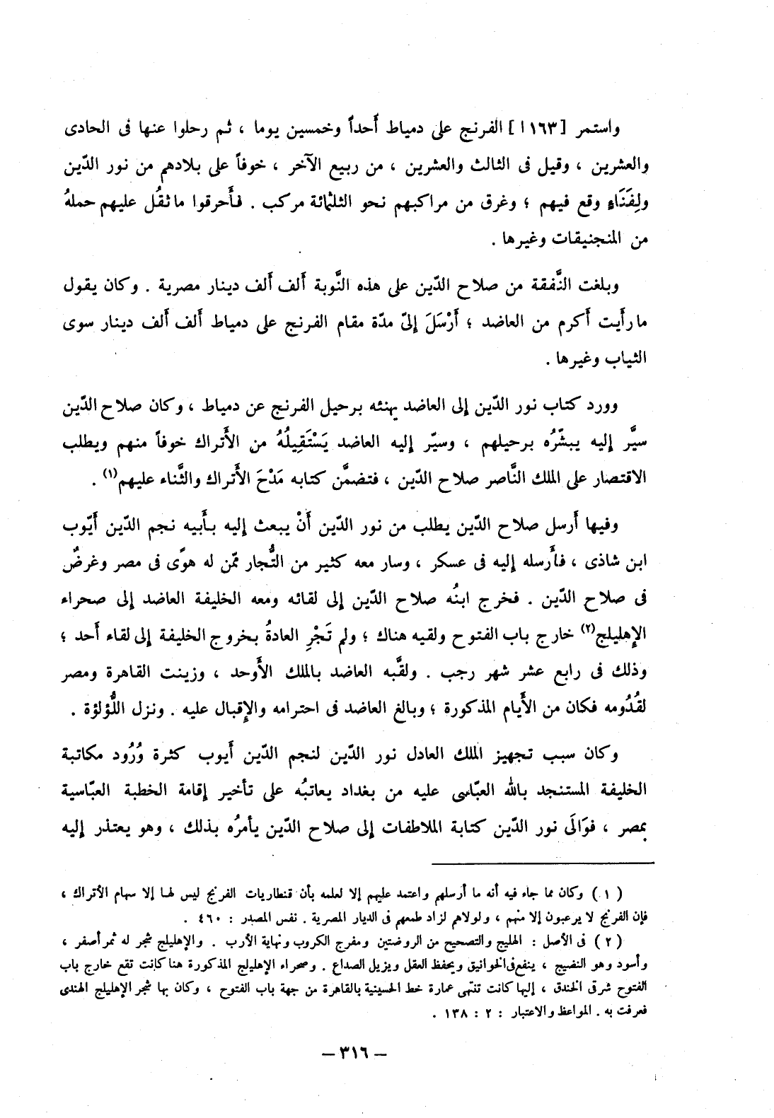 وبلغت النفقة من صلاح الدين على هذه النوبة ألف ألف دينار مصرية. وكان يقول ما رأيت أكرم من العاضد؛ أرسل إلى مدة مقام الفرنج على دمياط ألف ألف دينار سوى الثياب وغيرها.