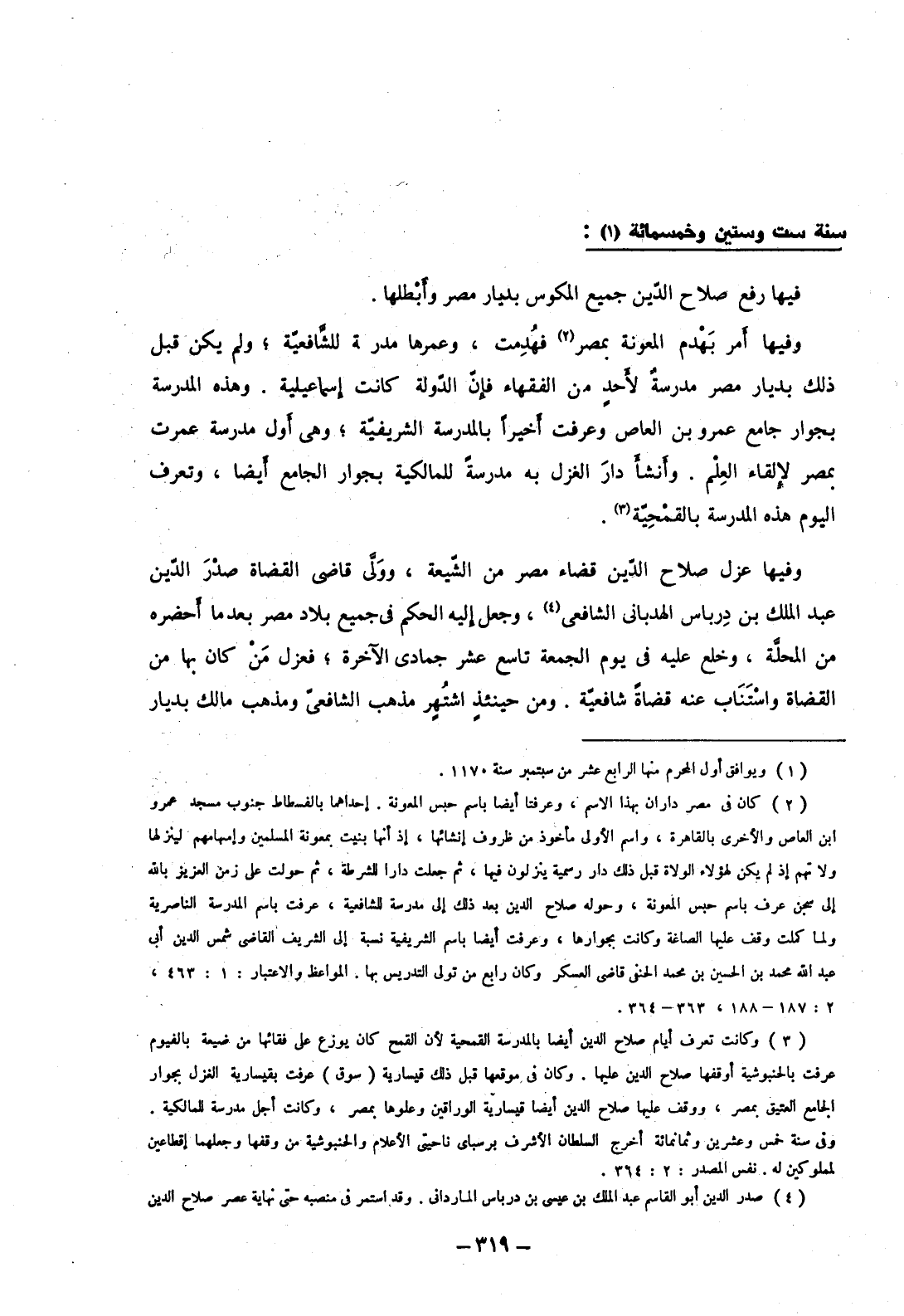 وفيها عزل صلاح الدين قضاء مصر من الشيعة، وولي قاضي القضاة صدر الدين عبد الملك بن درباس الهدباني الشافعي، وجعل إليه الحكم في جميع بلاد مصر بعدما أحضره من المحلة، وخلع عليه في يوم الجمعة تاسع عشر جمادى الآخرة؛ فعزل من كان بها من القضاة واستناب عنه قضاةً شافعية. ومن حينئذ اشتهر مذهب الشافعي ومذهب مالك بديار