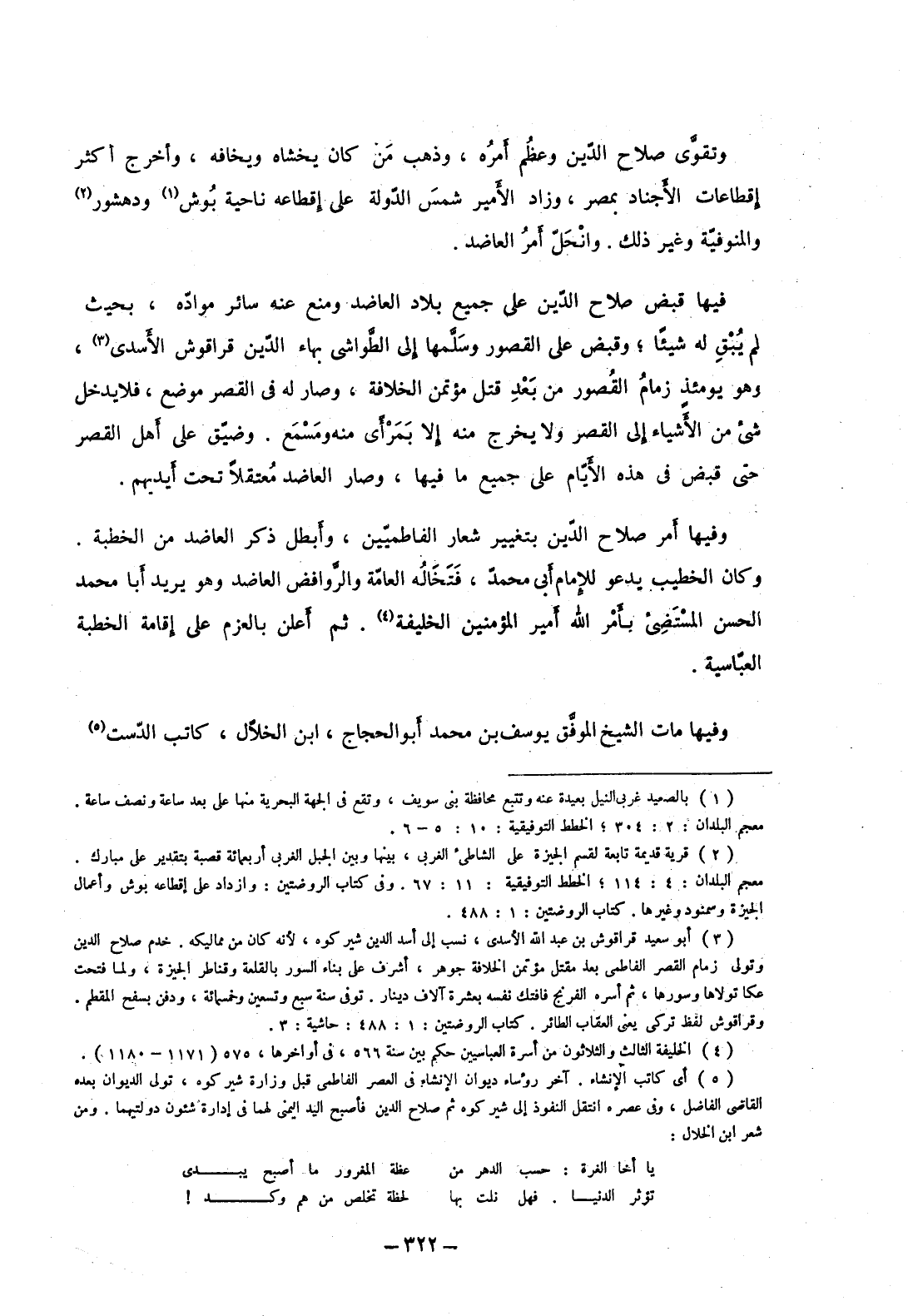 وتقوى صلاح الدين وعظم أمره، وذهب من كان يخشاه ويخافه، وأخرج أكثر إقطاعات الأجناد بمصر، وزاد الأمير شمس الدولة على إقطاعه ناحية بوش ودهشور والمنوفية وغير ذلك. وانحل أمر العاضد.
