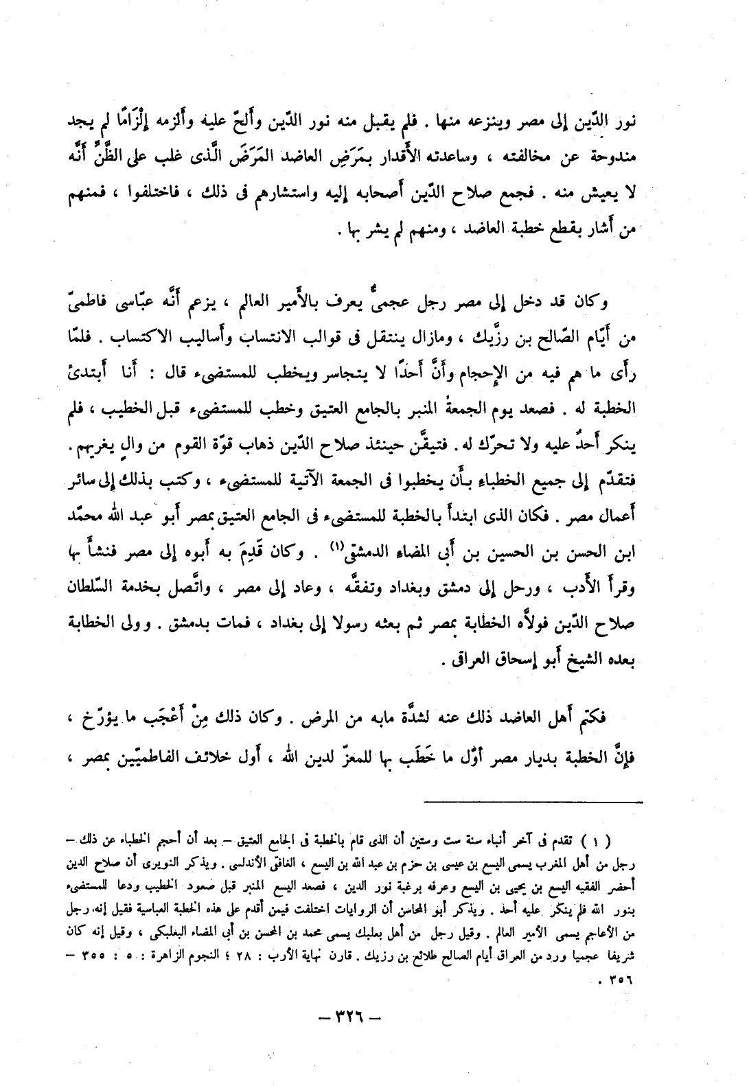 وكان قد دخل إلى مصر رجل عجمي يعرف بالأمير العالم، يزعم أنه عباسي فاطمي من أيام الصالح بن رزيك، وما زال ينتقل في قوالب الانتساب وأساليب الاكتساب. فلما رأى ما هم فيه من الإحجام وأن أحداً لا يتجاسر ويخطب للمستضيء قبل الخطيب، فلم ينكر أحد عليه ولا تحرك له. فتيقن حينئذ صلاح الدين ذهاب قوة القوم من وال يغريهم. فتقدم إلى جميع الخطباء بأن يخطبوا في الجمعة الآتية للمستضيء، وكتب بذلك إلى سائر أعمال مصر. فكان الذي ابتدأ بالخطبة للمستضيء في الجامع العتيق بمصر أبو عبد الله محمد ابن الحسن بن الحسين بن أبي المضاء الدمشقي. وكان قدم به أبوه إلى مصر فنشأ بها وقرأ الأدب، ورحل إلى دمشق وبغداد وتفقه، وعاد إلى مصر، واتصل بخدمة السلطان صلاح الدين فولاه الخطابة بمصر ثم بعثه رسولا إلى بغداد، فمات بدمشق. وولي الخطابة بعده الشيخ أبو إسحاق العراقي.