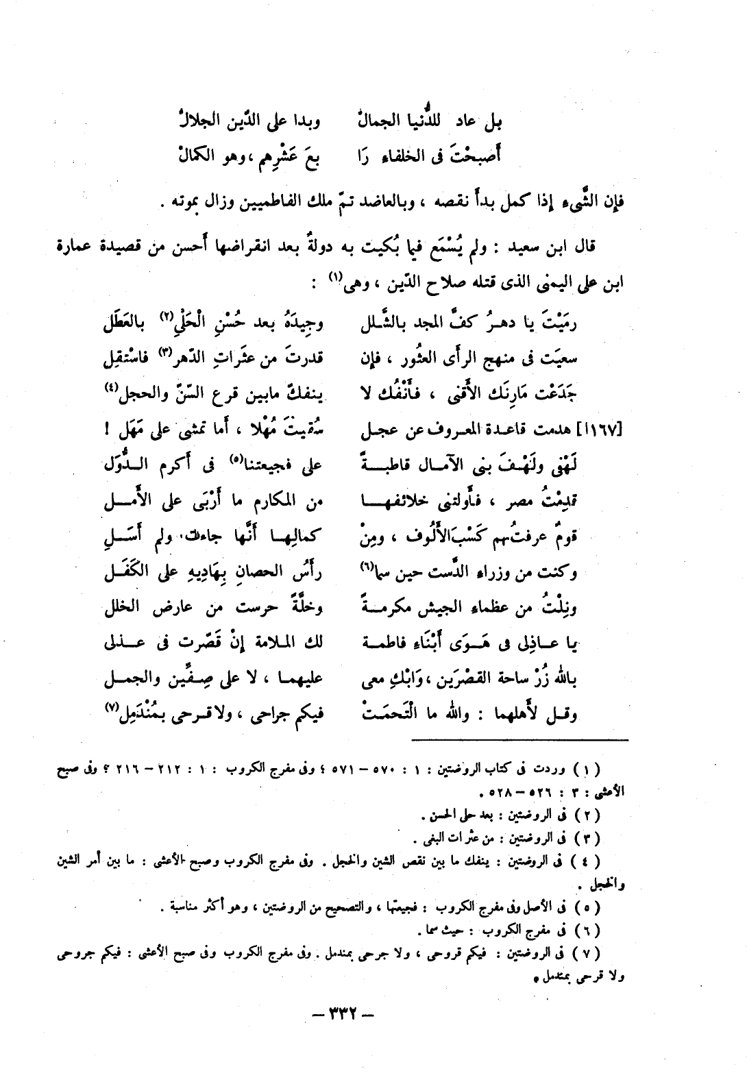 قال ابن سعيد: ولم يسمع فيما بكيت به دولة بعد انقراضها أحسن من قصيدة عمارة ابن علي اليمني الذي قتله صلاح الدين، وهي: