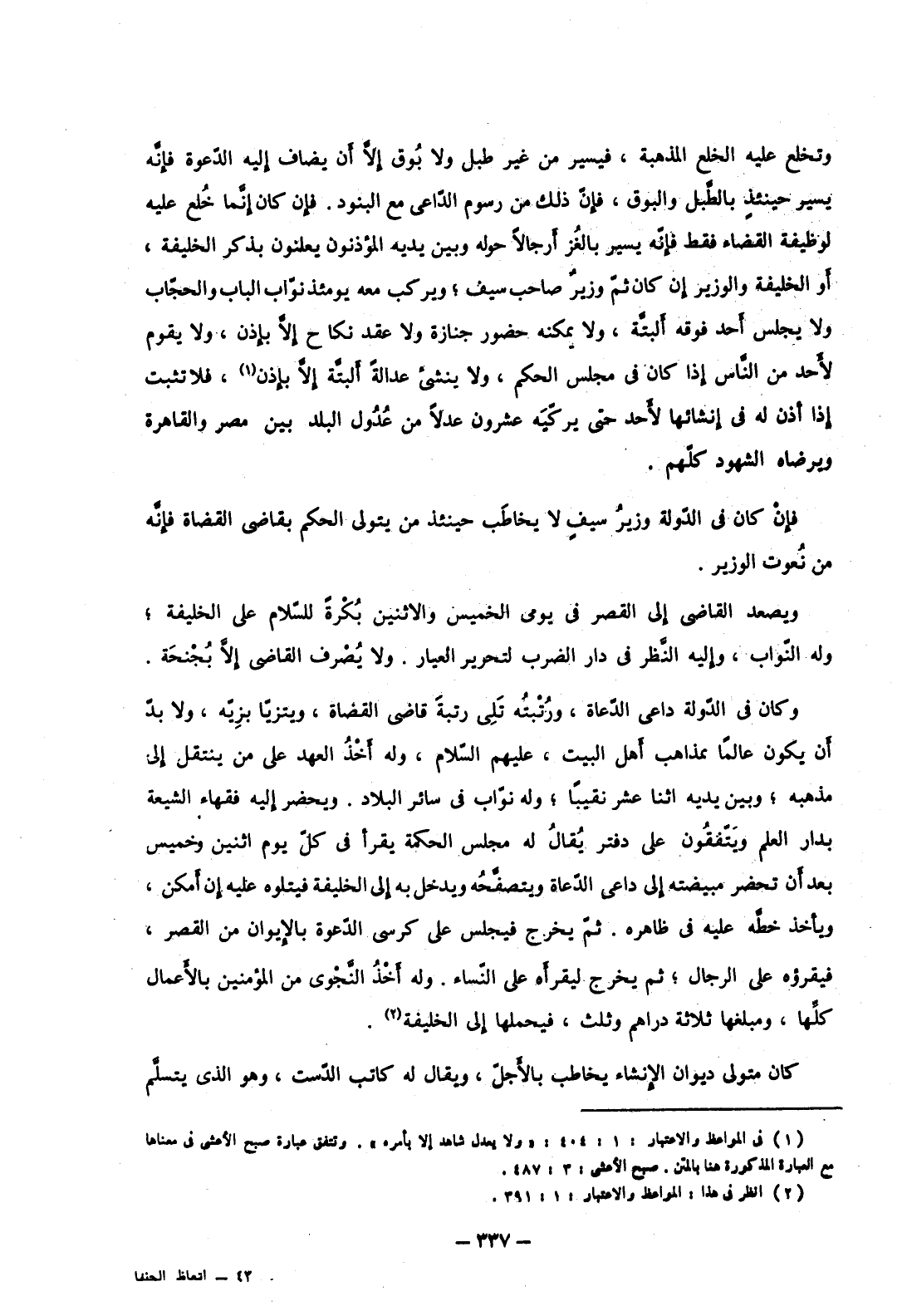 وتخلع عليه الخلع المذهبة، فيسير من غير طبل ولا بوق إلا أن يضاف إليه الدعوة فإنه يسير حينئذ بالطبل والبوق، فإن ذلك من رسوم الداعي مع البنود. فإن كان إنما خلع عليه لوظيفة القضاة فقط فإنه يسير بالعز أرجالاً حوله وبين يديه المؤذنون يعلنون بذكر الخليفة، أو الخليفة والوزير إن كان ثم وزير صاحب سيف؛ ويركب معه يومئذ نواب الباب والحجاب ولا يجلس أحد فوقه ألبتة، ولا يمكنه حضور جنازة ولا عقد نكاح إلا بإذن، ولا يقوم لأحد من الناس إذا كان في مجلس الحكم، ولا ينشئ عدالةً ألبتة إلا بإذن، فلا تثبت إذا أذن له في إنشائها لأحد حتى يركيه عشرون عدلاً من عدول البلد بين مصر والقاهرة ويرضاه الشهود كلهم.