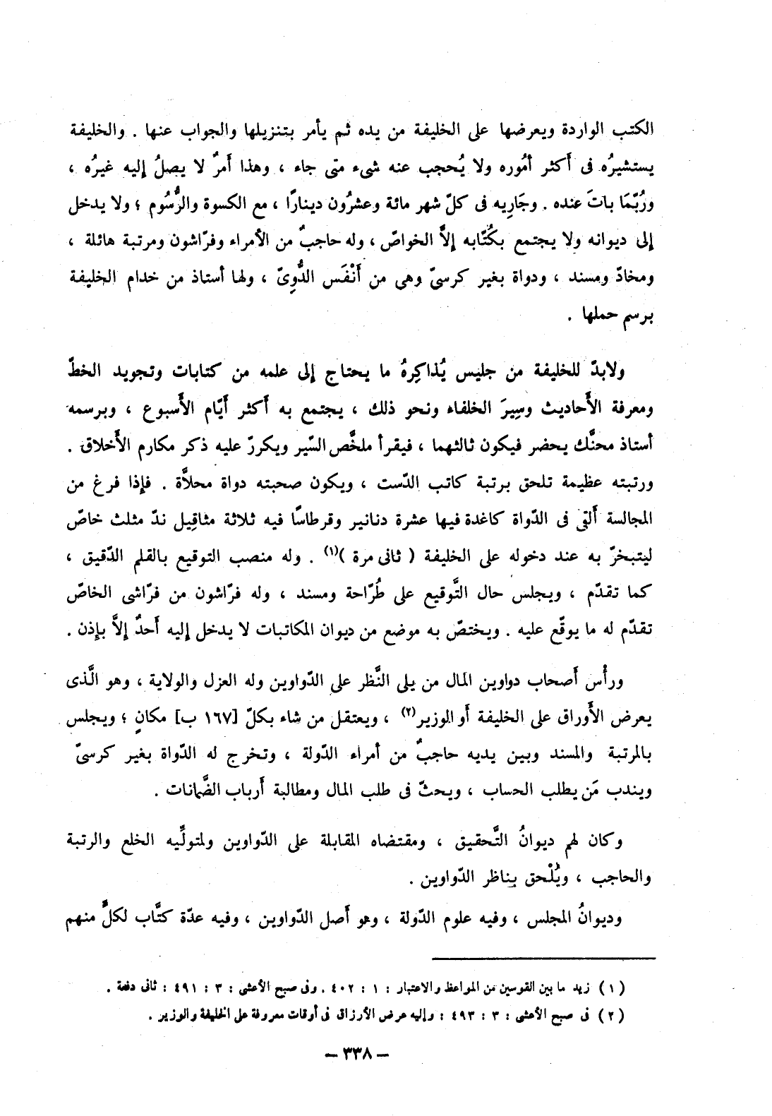 ولا بد للخليفة من جليس يذاكره ما يحتاج إلى علمه من كتابات وتجويد الخط ومعرفة الأحاديث وسير الخلفاء ونحو ذلك، يجتمع به أكثر أيام الأسبوع، وبرسمه أستاذ محنك يحضر فيكون ثالثهما، فيقرأ ملخص السير ويكرر عليه ذكر مكارم الأخلاق. ورتبته عظيمة تلحق برتبة كاتب الدست، ويكون صحبته دواة محلاة. فإذا فرغ من المجالسة ألقى في الدواة كاغدة فيها عشرة دنانير وقرطاساً فيه ثلاثة مثاقيل ند مثلث خاص ليتبخر به عند دخوله على الخليفة ثاني مرة. وله منصب التوقيع بالقلم الدقيق، كما تقدم، ويجلس حال التوقيع على طراحة ومسند، وله فراشون من فراشي الخاص تقدم له ما يوقع عليه. ويختص به موضع من ديوان المكاتبات لا يدخل إليه أحد إلا بإذن.