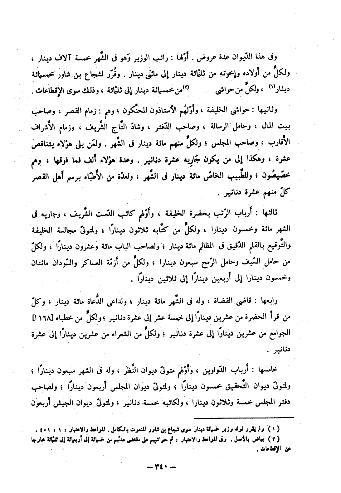 خامسها: أرباب الدواوين، وأولهم متولي ديوان النظر، وله في الشهر سبعون ديناراً؛ ولمتولي ديوان التحقيق خمسون ديناراً؛ ولمتولي ديوان المجلس أربعون ديناراً؛ ولصاحب دفتر المجلس خمسة وثلاثون دينارا، ولكاتبه خمسة دنانير؛ ولمتولي ديوان الجيش أربعون