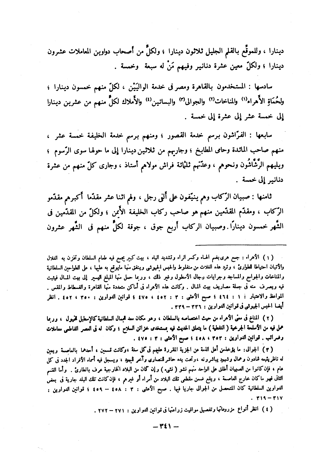 سادسها: المستخدمون بالقاهرة ومصر في خدمة الواليين، لكل منهم خمسون دينارا؛ ولحماة الأهراء والمناخات والجوالي والبساتين والأملاك لكل منهم من عشرين دينارا إلى خمسة عشر إلى عشرة إلى خمسة.