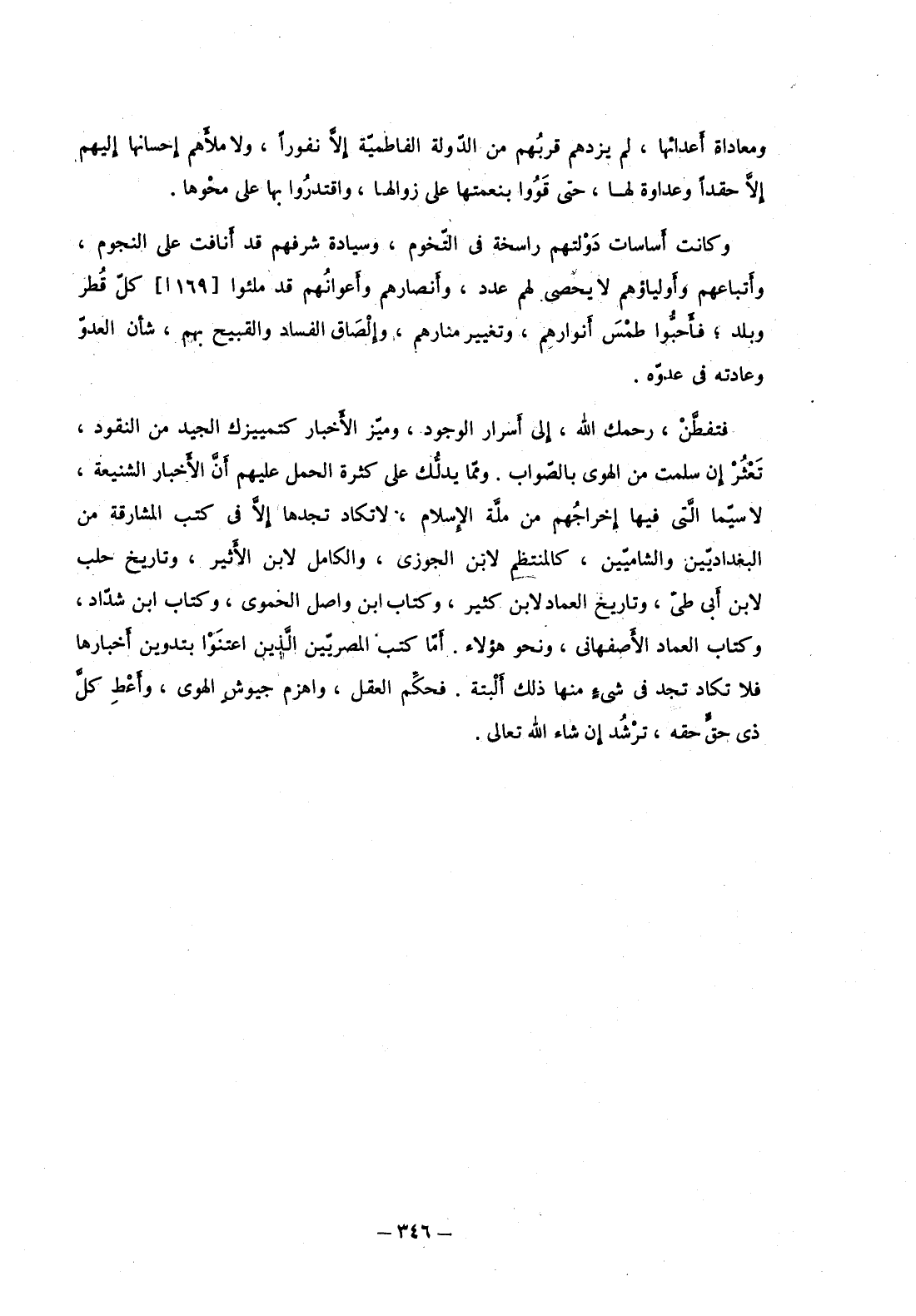 فتفطن، رحمك الله، إلى أسرار الوجود، وميز الأخبار كتمييزك الجيد من النقود، تعثر إن سلمت من الهوى بالصواب. ومما يدلك على كثرة الحمل عليهم أن الأخبار الشنيعة، لا سيما التي فيها إخراجهم من ملة الإسلام، لا تكاد تجدها إلا في كتب المشارقة من البغداديين والشاميين، كالمنتظم لابن الجوزي، والكامل لابن الأثير، وتاريخ حلب لابن أبي طي، وتاريخ العماد لابن كثير، وكتاب ابن واصل الحموي، وكتاب ابن شداد، وكتاب العماد الأصفهاني، ونحو هؤلاء. أما كتب المصريين الذين اعتنوا بتدوين أخبارها فلا تكاد تجد في شيء منها ذلك ألبتة. فحكم العقل، واهزم جيوش الهوى، وأعط كل ذي حق حقه، ترشد إن شاء الله تعالى.