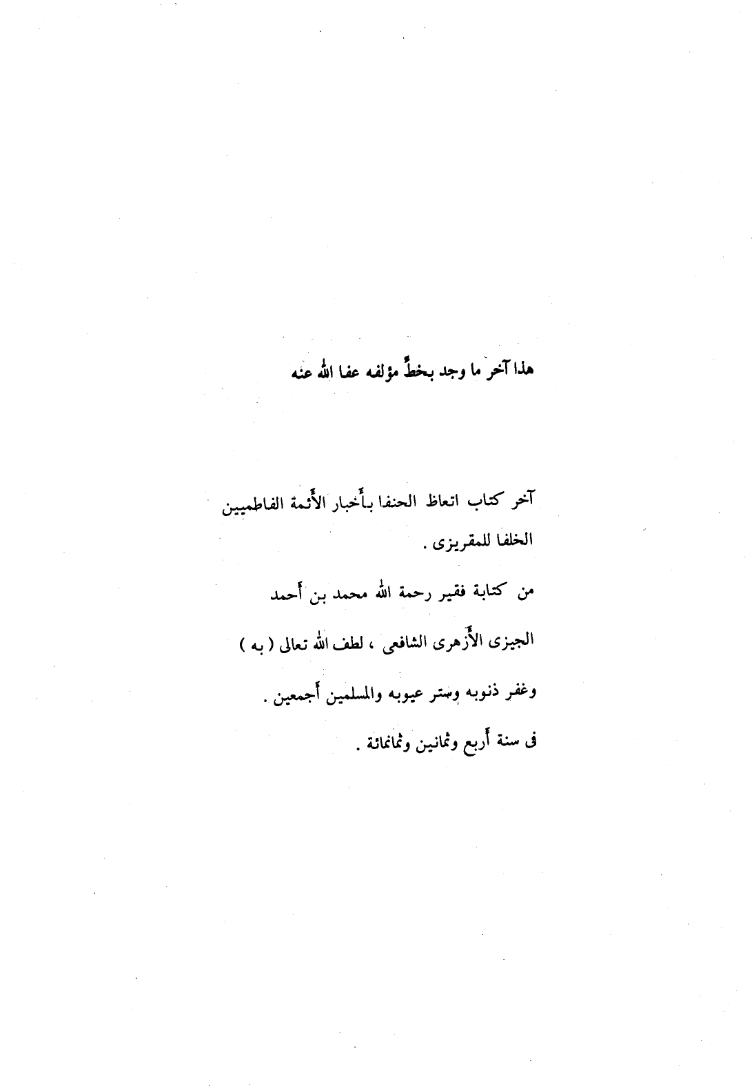 هذا آخر ما وجد بخط مؤلفه عفا الله عنه آخر كتاب اتعاظ الحنفا بأخبار الأئمة الفاطميين الخلفا للمقريزي.