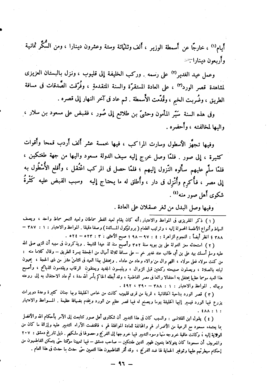 وعمل عيد الغدير على رسمه. وركب الخليفة إلى قليوب، ونزل بالبستان العزيزي لمشاهدة قصر الورد، على العادة المستقرة والسنة المتقدمة، وفرقت الصدقات في مسافة الطريق، وضربت الخيم، وقدمت الأسمطة. ثم عاد في آخر النهار إلى قصره.