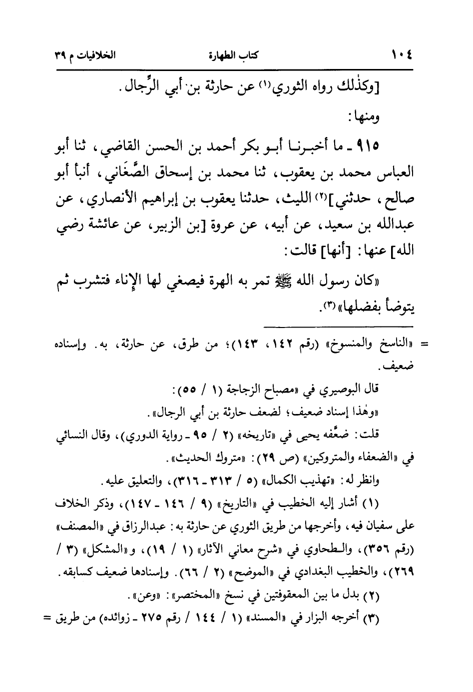 915- ما أخبرنا أبو بكر أحمد بن الحسن القاضي، ثنا أبو العباس محمد بن يعقوب، ثنا محمد بن إسحاق الصغاني، أنبأ أبو صالح، حدثني] الليث، حدثنا يعقوب بن إبراهيم الأنصاري، عن عبد الله بن سعيد، عن أبيه، عن عروة [بن الزبير، عن عائشة رضي الله عنها]: [أنها] قالت:
