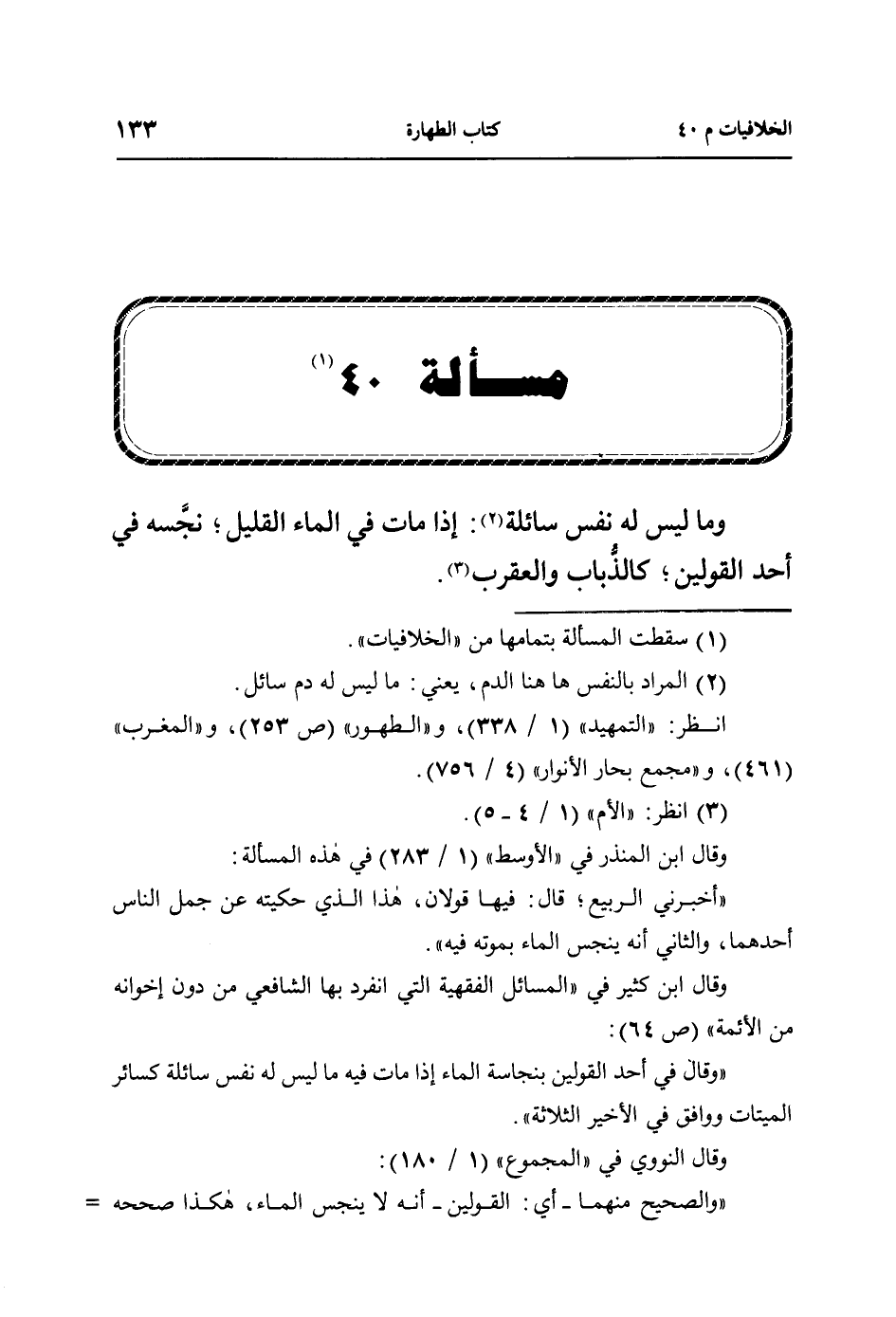 مسألة (40): وما ليس له نفس سائلة: إذا مات في الماء القليل؛ نجسه في أحد القولين؛ كالذباب والعقرب.