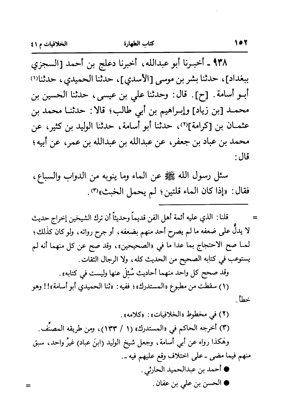 938- أخبرنا أبو عبد الله، أخبرنا دعلج بن أحمد [السجزي ببغداد]، حدثنا بشر بن موسى [الأسدي]، حدثنا الحميدي، حدثنا أبو أسامة. [ح]. قال: وحدثنا علي بن عيسى، حدثنا الحسين بن محمد [بن زياد] وإبراهيم بن أبي طالب؛ قالا: حدثنا محمد بن عثمان بن [كرامة]، حدثنا أبو أسامة، حدثنا الوليد بن كثير، عن محمد بن عباد بن جعفر، عن عبد الله بن عبد الله بن عمر، عن أبيه؛ قال: