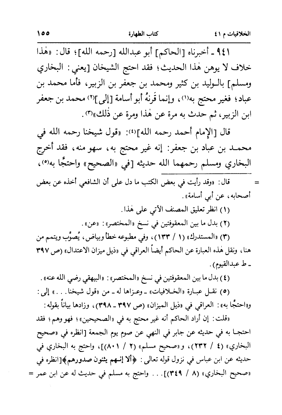 941- أخبرناه [الحاكم] أبو عبد الله [رحمه الله]؛ قال: ((هذا خلاف لا يوهن هذا الحديث؛ فقد احتج الشيخان [يعني: البخاري ومسلم] بالوليد بن كثير ومحمد بن جعفر بن الزبير، فأما محمد بن عباد، فغير محتج به، وإنما قرنه أبو أسامة [إلى] محمد بن جعفر ابن الزبير، ثم حدث به مرة عن هذا ومرة عن ذلك)).