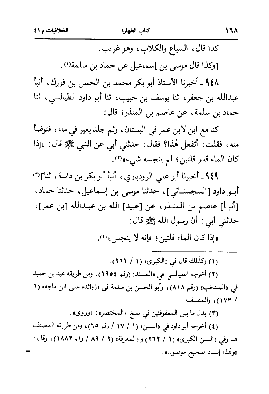 948- أخبرنا الأستاذ أبو بكر محمد بن الحسن بن فورك، أنبأ عبد الله بن جعفر، ثنا يوسف بن حبيب، ثنا أبو داود الطيالسي، ثنا حماد بن سلمة، عن عاصم بن المنذر؛ قال:
