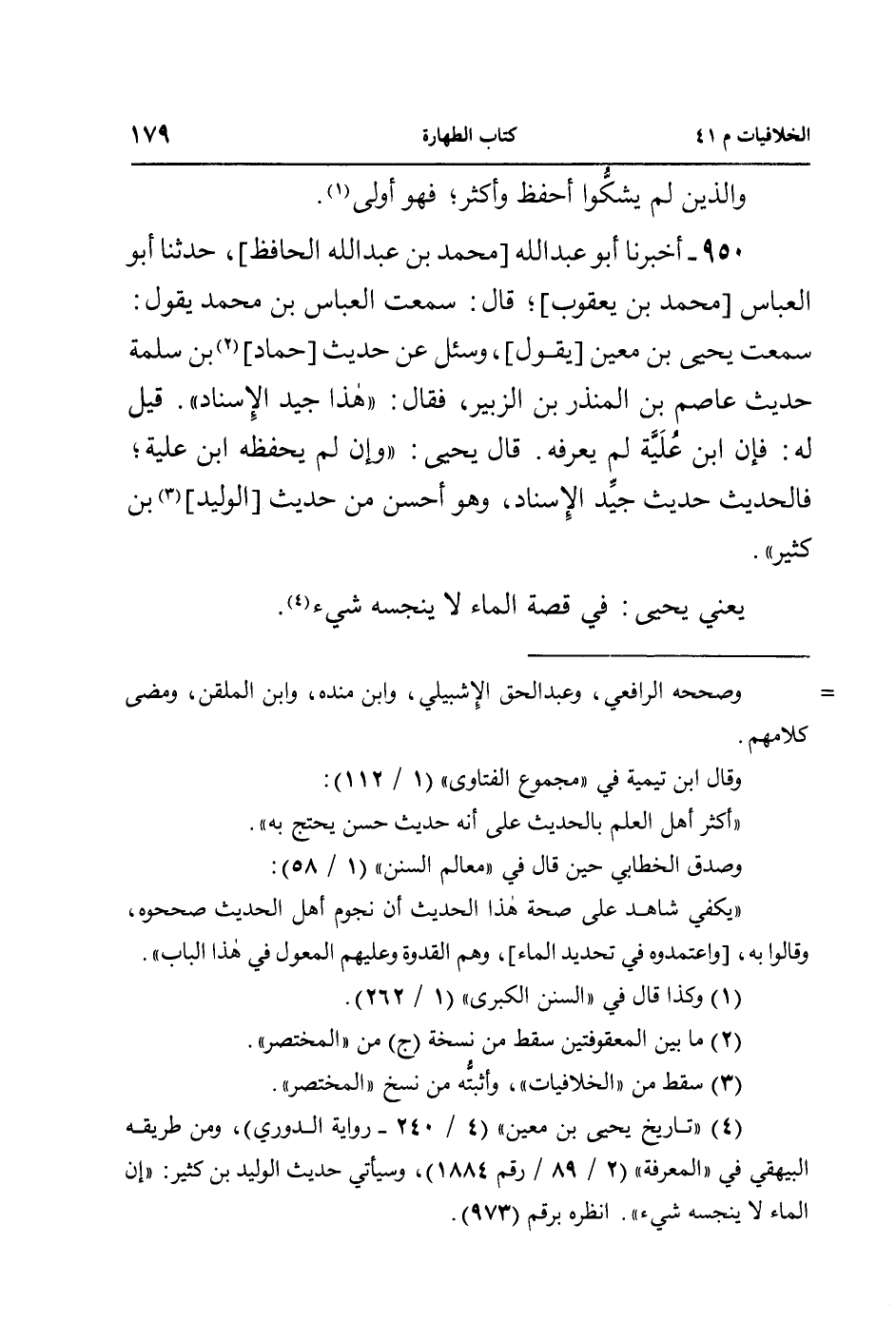 950- أخبرنا أبو عبد الله [محمد بن عبد الله الحافظ]، حدثنا أبو العباس [محمد بن يعقوب]؛ قال: سمعت العباس بن محمد يقول: سمعت يحيى بن معين [يقول]، وسئل عن حديث [حماد] بن سلمة حديث عاصم بن المنذر بن الزبير، فقال: ((هذا جيد الإسناد)). قيل له: فإن ابن علية لم يعرفه. قال يحيى: ((وإن لم يحفظه ابن علية؛ فالحديث حديث جيد الإسناد، وهو أحسن من حديث [الوليد] بن كثير)).