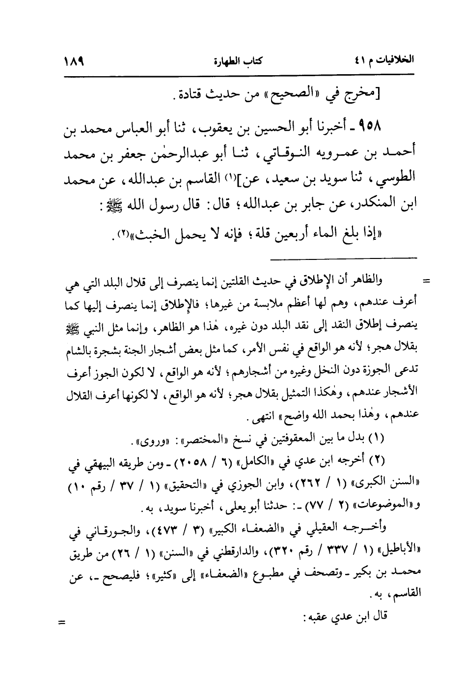 ((إذا بلغ الماء أربعين قلة؛ فإنه لا يحمل الخبث)).