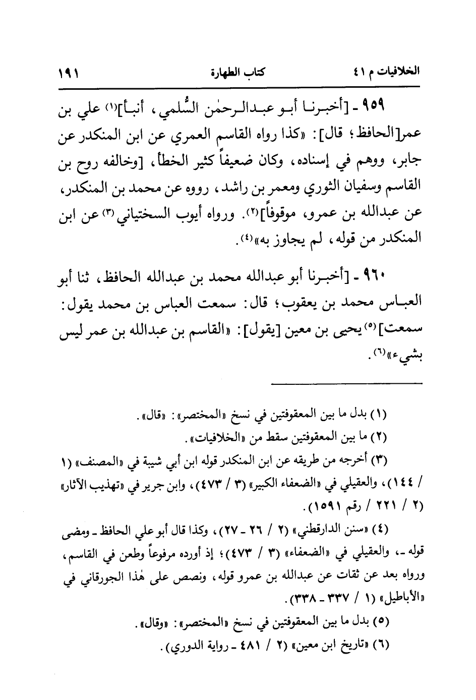 959- [أخبرنا أبو عبد الرحمن السلمي، أنبأ] علي بن عمر [الحافظ؛ قال]: ((كذا رواه القاسم العمري عن ابن المنكدر عن جابر، ووهم في إسناده، وكان ضعيفاً كثير الخطأ، [وخالفه روح بن القاسم وسفيان الثوري ومعمر بن راشد، رووه عن محمد بن المنكدر، عن عبد الله بن عمرو، موقوفاً]. ورواه أيوب السختياني عن ابن المنكدر من قوله، لم يجاوز به)).