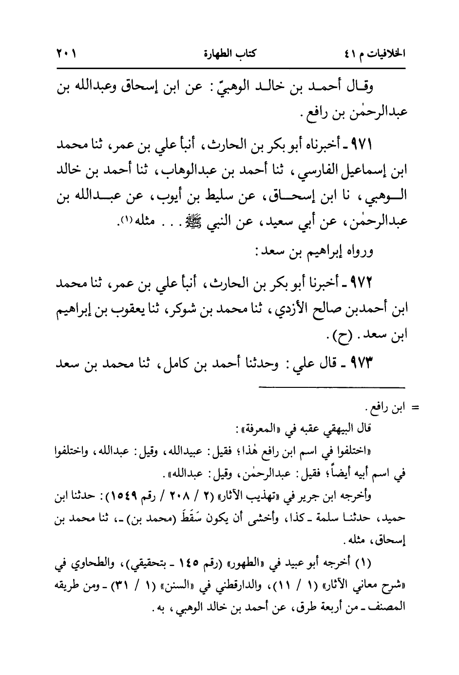 971- أخبرناه أبو بكر بن الحارث، أنبأ علي بن عمر، ثنا محمد ابن إسماعيل الفارسي، ثنا أحمد بن عبد الوهاب، ثنا أحمد بن خالد الوهبي، نا ابن إسحاق، عن سليط بن أيوب، عن عبد الله بن عبد الرحمن، عن أبي سعيد، عن النبي صلى الله عليه وسلم .. .. مثله.