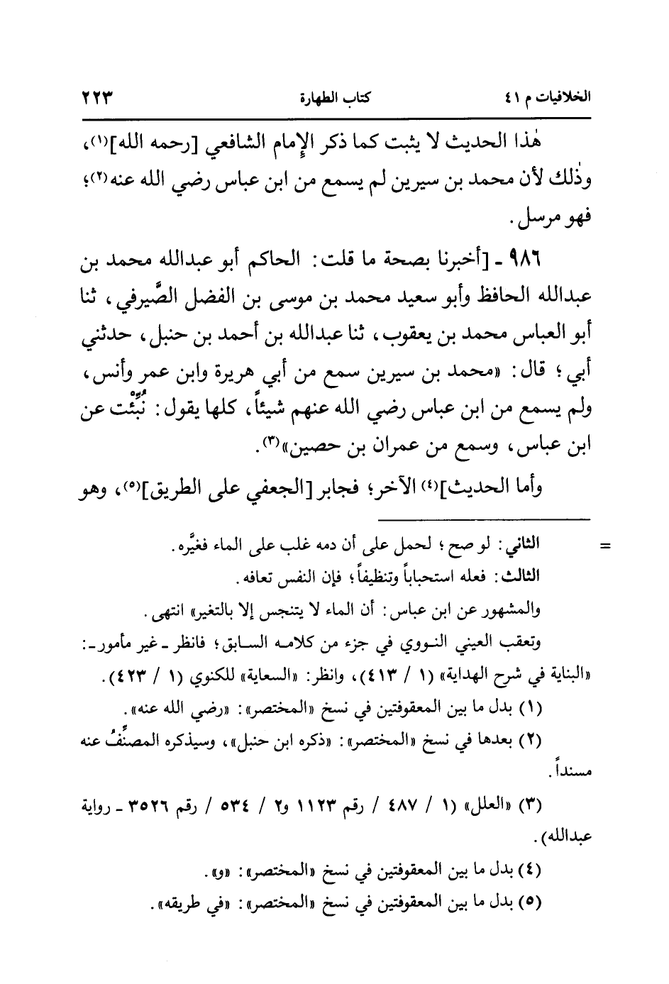 986- [أخبرنا بصحة ما قلت: الحاكم أبو عبد الله محمد بن عبد الله الحافظ وأبو سعيد محمد بن موسى بن الفضل الصيرفي، ثنا أبو العباس محمد بن يعقوب، ثنا عبد الله بن أحمد بن حنبل، حدثني أبي؛ قال: ((محمد بن سيرين سمع من أبي هريرة وابن عمر وأنس، ولم يسمع من ابن عباس رضي الله عنهم شيئاً، كلها يقول: نبئت عن ابن عباس، وسمع من عمران بن حصين)).