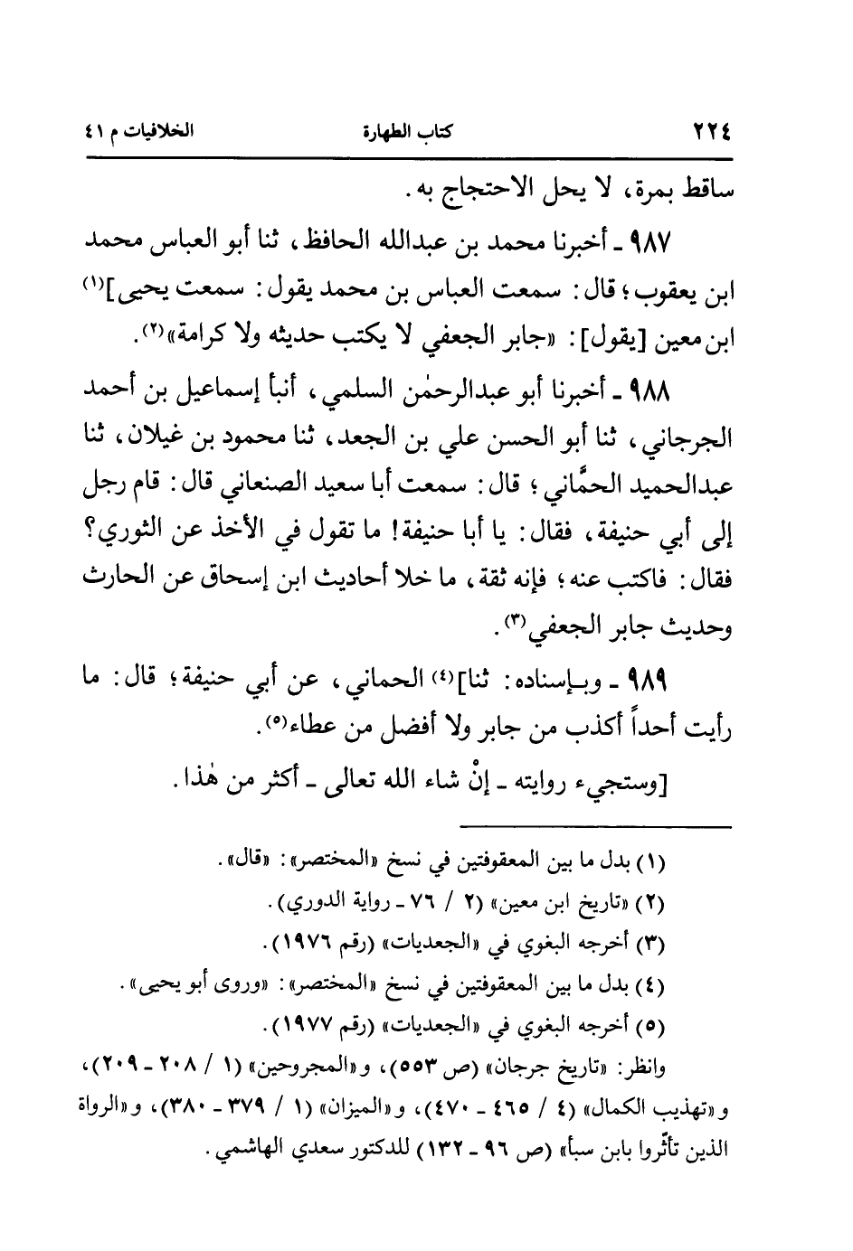 987- أخبرنا محمد بن عبد الله الحافظ، ثنا أبو العباس محمد ابن يعقوب؛ قال: سمعت العباس بن محمد يقول: سمعت يحيى] ابن معين [يقول]: ((جابر الجعفي لا يكتب حديثه ولا كرامة)).