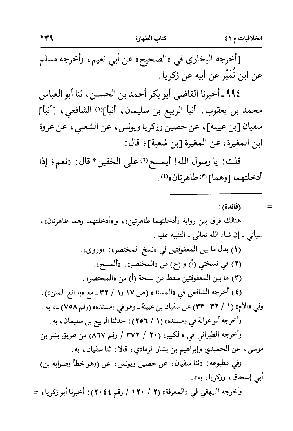 994- أخبرنا القاضي أبو بكر أحمد بن الحسن، ثنا أبو العباس محمد بن يعقوب، أنبأ الربيع بن سليمان، أنبأ] الشافعي، [أنبأ] سفيان [بن عيينة]، عن حصين وزكريا ويونس، عن الشعبي، عن عروة ابن المغيرة، عن المغيرة [بن شعبة]؛ قال: