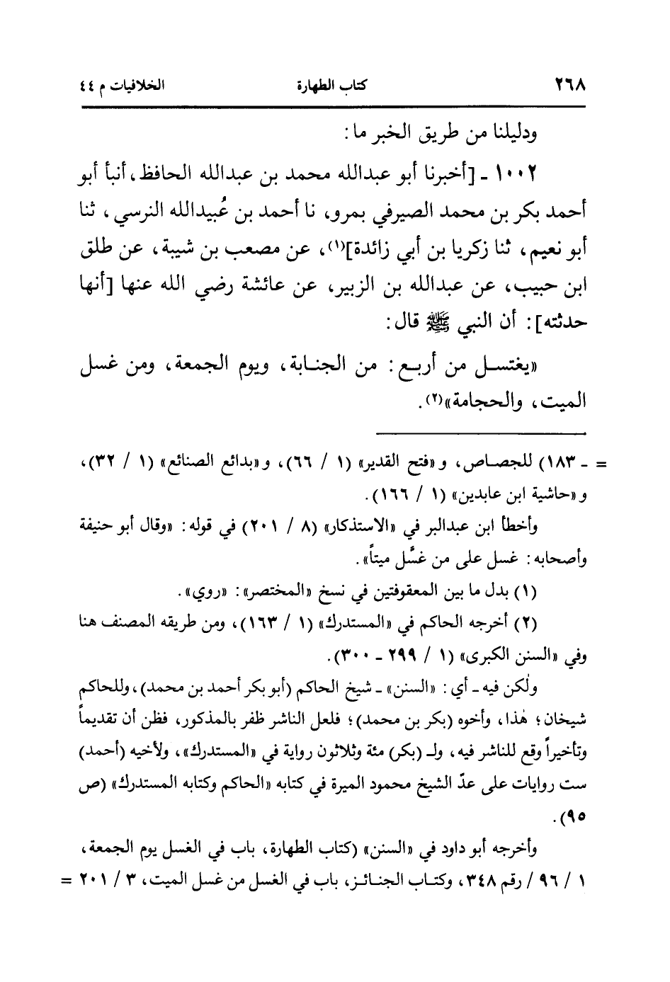 1002- [أخبرنا أبو عبد الله محمد بن عبد الله الحافظ، أنبأ أبو أحمد بكر بن محمد الصيرفي بمرو، نا أحمد بن عبيد الله النرسي، ثنا أبو نعيم، ثنا زكريا بن أبي زائدة]، عن مصعب بن شيبة، عن طلق ابن حبيب، عن عبد الله بن الزبير، عن عائشة رضي الله عنها [أنها حدثته]: أن النبي صلى الله عليه وسلم قال: