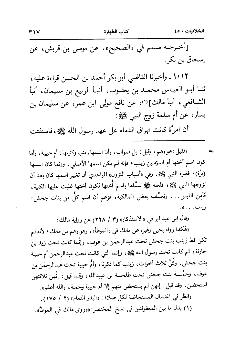 1012- وأخبرنا القاضي أبو بكر أحمد بن الحسن قراءة عليه، ثنا أبو العباس محمد بن يعقوب، أنبأ الربيع بن سليمان، أنبأ الشافعي، أنبأ مالك]، عن نافع مولى ابن عمر، عن سليمان بن يسار، عن أم سلمة زوج النبي صلى الله عليه وسلم :