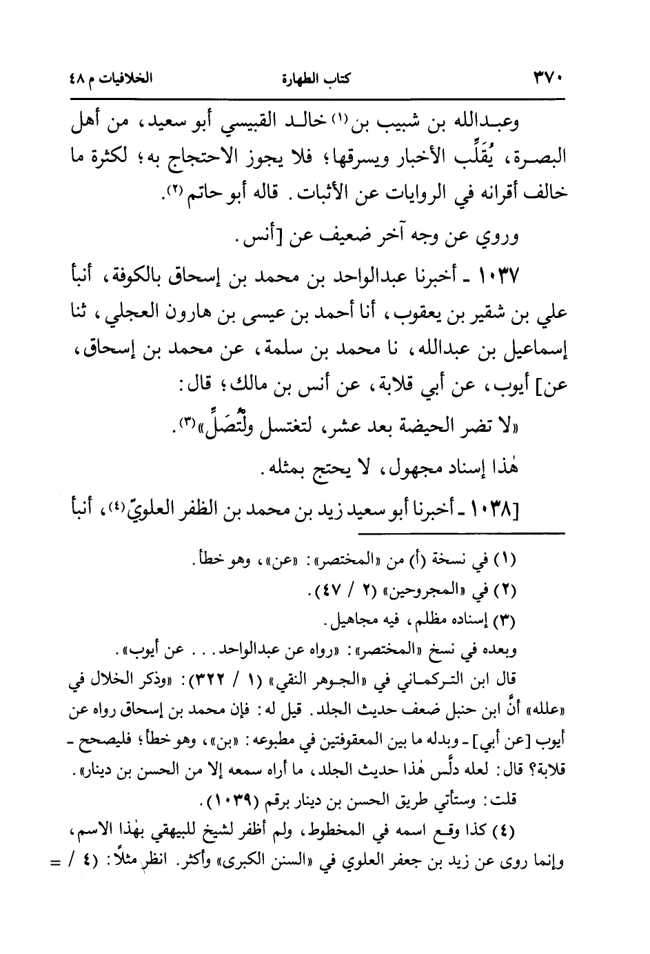 1037- أخبرنا عبد الواحد بن محمد بن إسحاق بالكوفة، أنبأ علي بن شقير بن يعقوب، أنا أحمد بن عيسى بن هارون العجلي، ثنا إسماعيل بن عبد الله، نا محمد بن سلمة، عن محمد بن إسحاق، عن] أيوب، عن أبي قلابة، عن أنس بن مالك؛ قال: