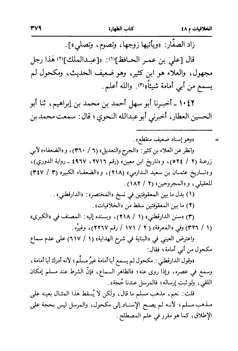 قال [علي بن عمر الحافظ]: (([عبد الملك] هذا رجل مجهول، والعلاء هو ابن كثير، وهو ضعيف الحديث، ومكحول لم يسمع من أبي أمامة شيئاً)). والله أعلم.