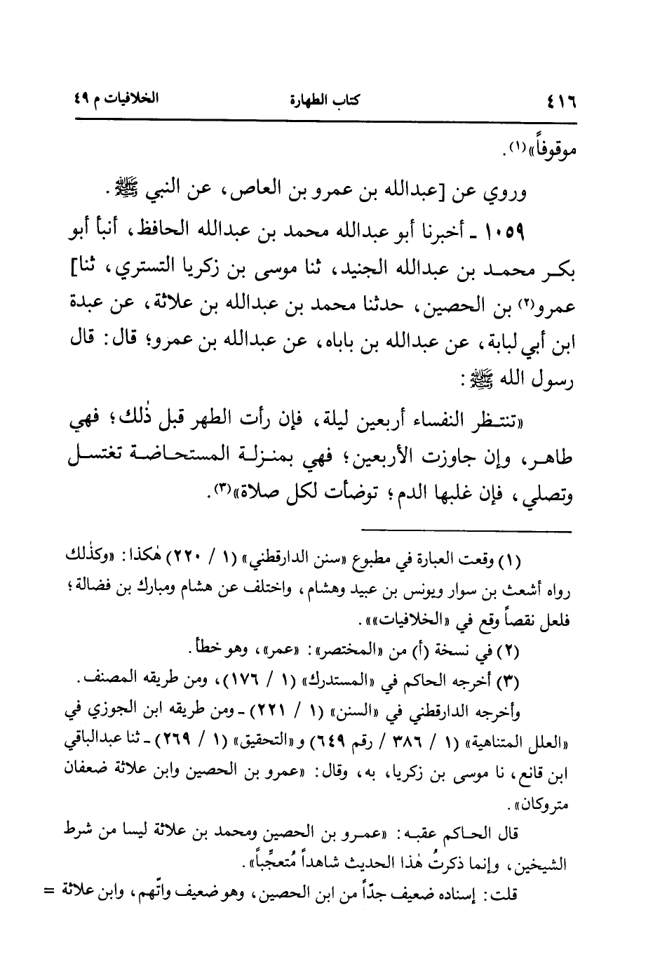 1059- أخبرنا أبو عبد الله محمد بن عبد الله الحافظ، أنبأ أبو بكر محمد بن عبد الله الجنيد، ثنا موسى بن زكريا التستري، ثنا] عمرو بن الحصين، حدثنا محمد بن عبد الله بن علاثة، عن عبدة ابن أبي لبابة، عن عبد الله بن باباه، عن عبد الله بن عمرو؛ قال: قال رسول الله صلى الله عليه وسلم :
