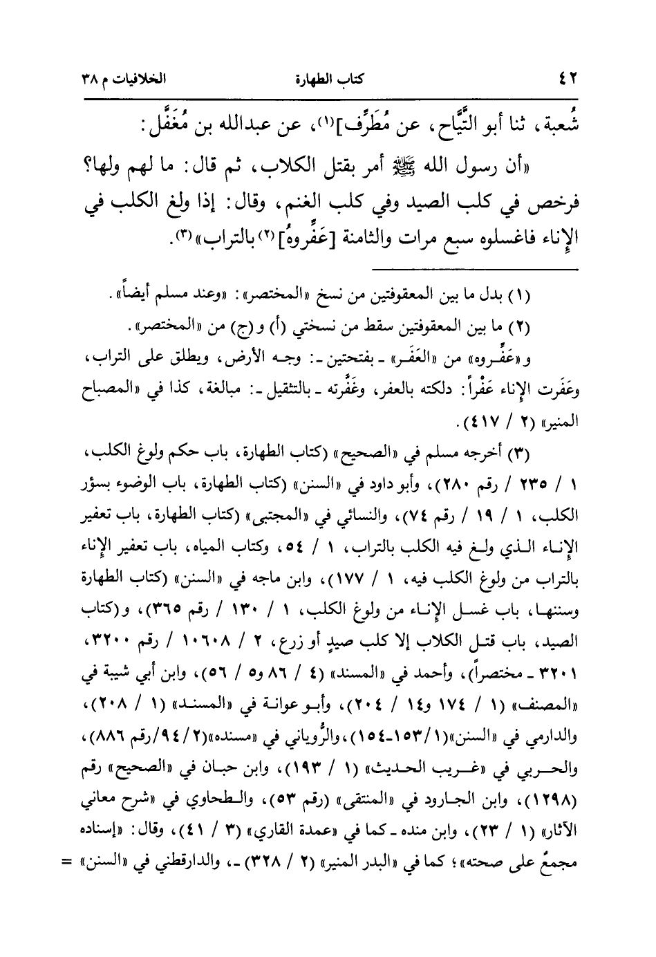 ((أن رسول الله صلى الله عليه وسلم أمر بقتل الكلاب، ثم قال: ما لهم ولها؟ فرخص في كلب الصيد وفي كلب الغنم، وقال: إذا ولغ الكلب في الإناء فاغسلوه سبع مرات والثامنة [عفروه] بالتراب)).