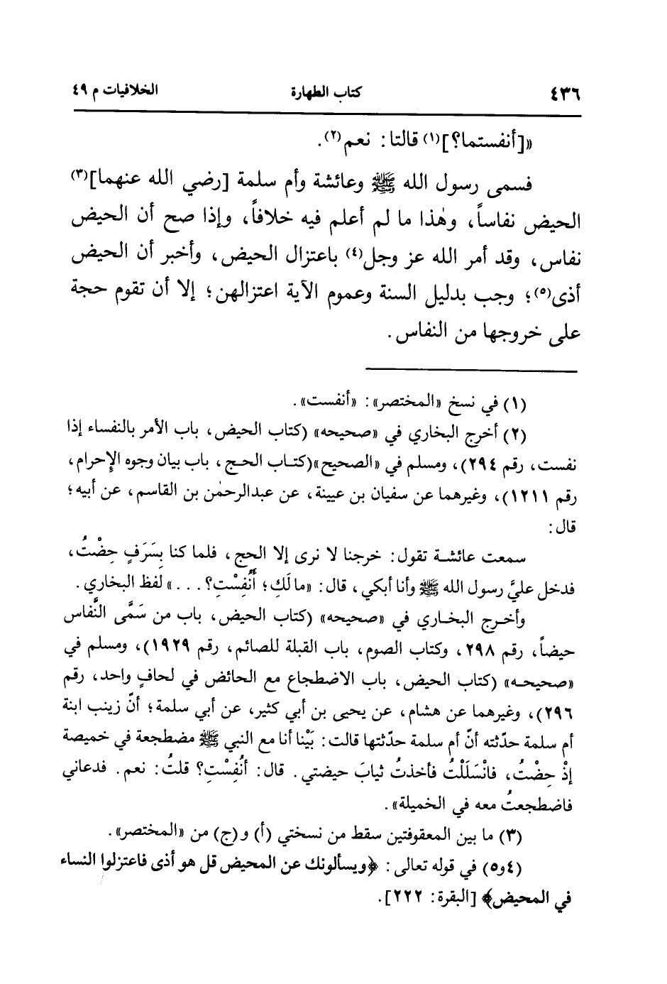 فسمى رسول الله صلى الله عليه وسلم وعائشة وأم سلمة [رضي الله عنهما] الحيض نفاساً، وهذا ما لم أعلم فيه خلافاً، وإذا صح أن الحيض نفاس، وقد أمر الله عز وجل، باعتزال الحيض، وأخبر أن الحيض أذى؛ وجب بدليل السنة وعموم الآية اعتزالهن؛ إلا أن تقوم حجة على خروجها من النفاس.