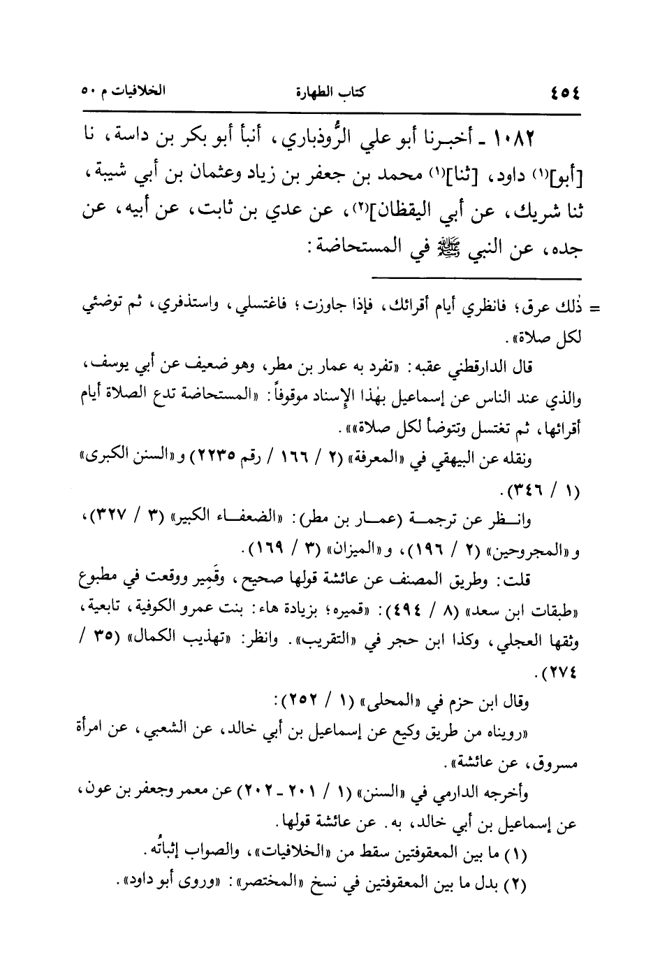 1082- أخبرنا أبو علي الروذباري، أنبأ أبو بكر بن داسة، نا [أبو] داود، [ثنا] محمد بن جعفر بن زياد وعثمان بن أبي شيبة، ثنا شريك، عن أبي اليقظان]، عن عدي بن ثابت، عن أبيه، عن جده، عن النبي صلى الله عليه وسلم في المستحاضة: