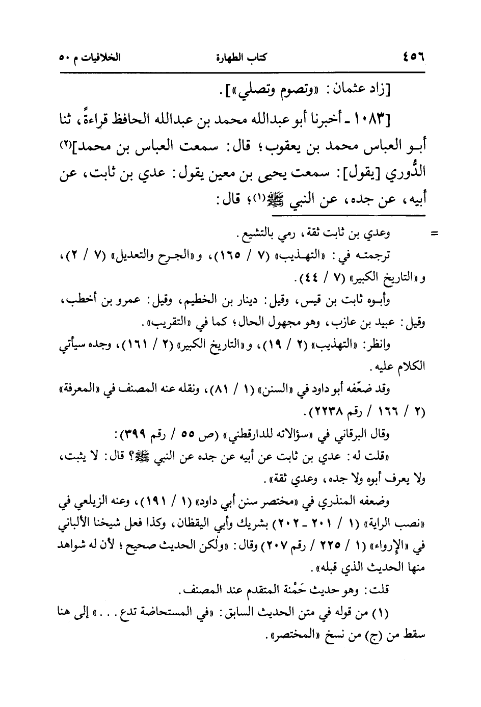 1083- [أخبرنا أبو عبد الله محمد بن عبد الله الحافظ قراءةً، ثنا أبو العباس محمد بن يعقوب؛ قال: سمعت العباس بن محمد] الدوري [يقول]: سمعت يحيى بن معين يقول: عدي بن ثابت، عن أبيه، عن جده، عن النبي صلى الله عليه وسلم ؛ قال: