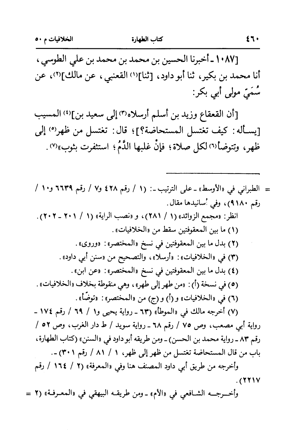 1087- [أخبرنا الحسين بن محمد بن محمد بن علي الطوسي، أنا محمد بن بكير، ثنا أبو داود [ثنا] القعنبي، عن مالك]، عن سمي مولى أبي بكر:
