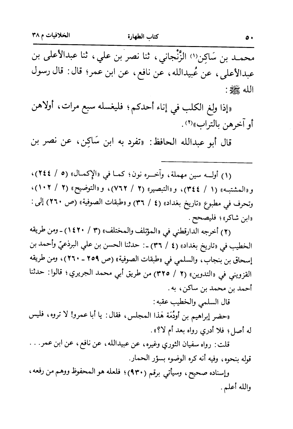 محمد بن ساكن الزنجاني، ثنا نصر بن علي، ثنا عبد الأعلى بن عبد الأعلى، عن عبيد الله، عن نافع، عن ابن عمر؛ قال: قال رسول الله صلى الله عليه وسلم :