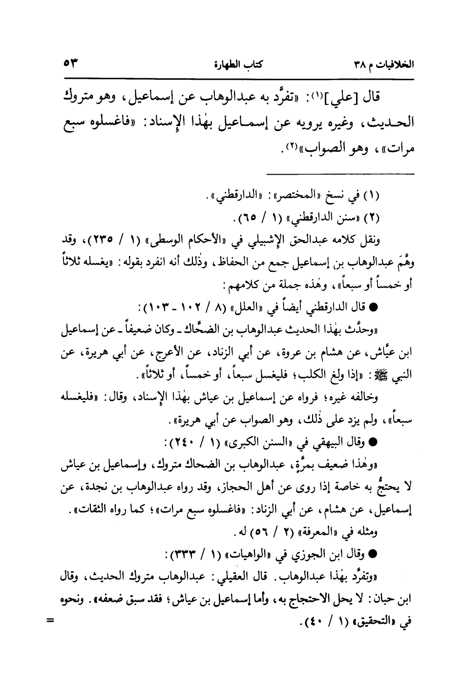 قال [علي]: ((تفرد به عبد الوهاب عن إسماعيل، وهو متروك الحديث، وغيره يرويه عن إسماعيل بهذا الإسناد: ((فاغسلوه سبع مرات))، وهو الصواب)).