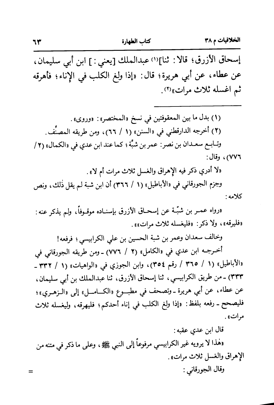 إسحاق الأزرق؛ قالا: ثنا] عبد الملك [يعني:] ابن أبي سليمان، عن عطاء، عن أبي هريرة؛ قال: ((إذا ولغ الكلب في الإناء؛ فأهرقه ثم اغسله ثلاث مرات)).