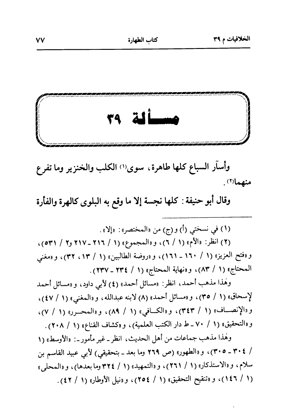 مسألة (39): وأسآر السباع كلها طاهرة، سوى الكلب والخنزير وما تفرع منهما.